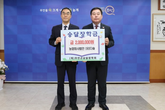 [파이낸셜경제=김예빈 기자] 무안군은 지난 9일 농업회사법인 유한회사 다솔 김지수 대표가 지역 인재 육성을 위해 (재)무안군승달장학회에 장학금 200만 원을 기탁했다고 밝혔다.