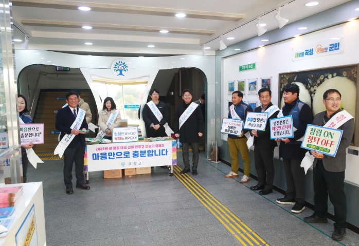[파이낸셜경제=김예빈 기자] 전남 곡성군은 설 명절을 앞둔 지난 4일, 청사 출입구 앞에서 ‘선물 안 주고 안 받기’ 메시지를 내걸고 청렴 캠페인을 전개했다고 밝혔다.