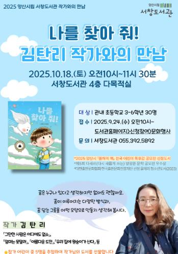 [파이낸셜경제=김예빈 기자] 양산시립 서창도서관은 10월 18일 오전 10시 2025년 양산시 올해의 책 전국 독후감 공모전 선정도서인『나를 찾아줘!』의 저자 김탄리 작가를 초청해 작가와의 만남을 운영한다.