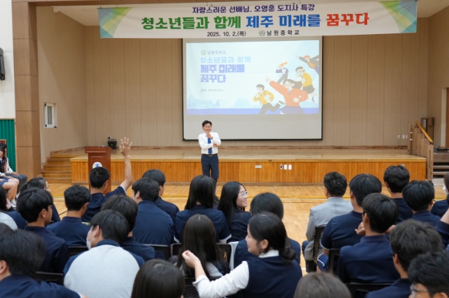 [파이낸셜경제=김영란 기자] 오영훈 제주특별자치도지사는 2일 남원중학교(교장 오경석)를 찾아 전교생을 대상으로 특별강연을 열고, “남원과 제주를 넘어 아시아, 나아가 우주까지 여러분의 무대가 돼야 한다”며 청소년들의 꿈과 도전을 격려했다.