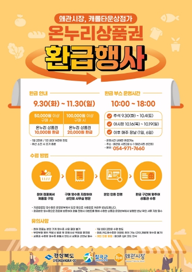 [파이낸셜경제=김지훈 기자] 칠곡군은 전통시장 활성화와 지역경제 활력 제고를 위해 9월 30일(화)부터 11월 30일(일)까지 전통시장 구매 고객을 대상으로 온누리상품권 환급행사를 진행한다.