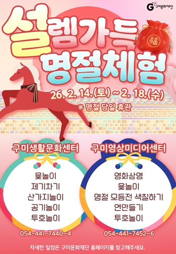 이한석 (재)구미문화재단 대표이사는 “설 연휴에도 시민들이 가까운 문화공간에서 가족과 함께 즐거운 시간을 보낼 수 있도록 준비했다.”며 “전통 놀이와 영화 상영을 통해 세대가 함께 어우러지는 따뜻한 명절이 되길 바란다.”고 밝혔다.