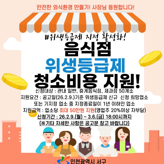 | ▲ 인천 서구, 음식점 위생등급제 ‘청소비 지원’으로 문턱 낮춘다 |