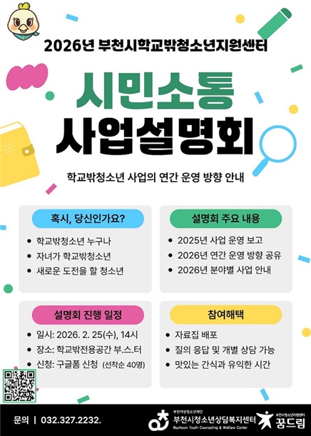 [파이낸셜경제=김기보 기자] 부천시학교밖청소년지원센터는 오는 2월 25일, 오후 2시 학교밖청소년 전용공간 부.스.터. (송내어울마당 1층)에서 시민과의 소통을 확대하고 2026년 연간 운영계획을 공유하는 ‘사업설명회’를 개최한다고 밝혔다.