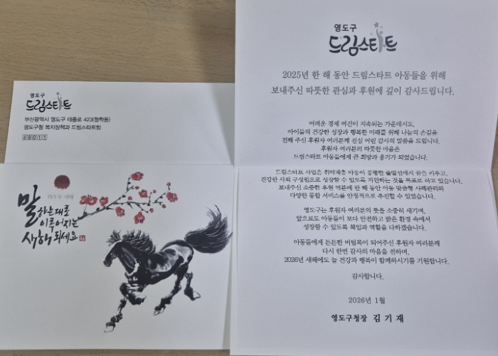 [파이낸셜경제=박영진 기자] 영도구 드림스타트는 지난 1월 16일 드림스타트 아동을 위해 후원과 협력을 이어온 후원업체 및 협약기관 37곳에 감사 서한을 발송했다.