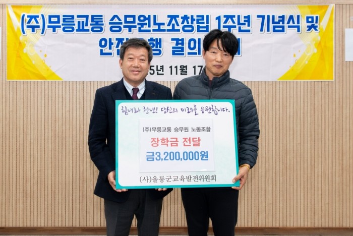 [파이낸셜경제=김지훈 기자] 지난 17일, 주식회사 무릉교통 승무원노동조합은 (사)울릉군교육발전위원회에 지역 학생들의 꿈을 응원하는 마음을 담아 장학금 320만 원을 기탁했다.