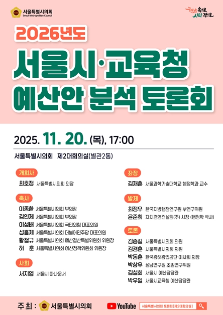 [파이낸셜경제=김예빈 기자] 서울특별시의회는 2025년 11월 20일 오후 5시, 서울특별시의회 제2대회의실에서 '2026년도 서울시·교육청 예산안 분석 토론회'를 개최한다.