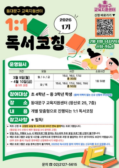 [파이낸셜경제=김예빈 기자] 서울 동대문구가 학생 맞춤형 독서교육 프로그램인 ‘2026년 상반기 1:1 독서코칭’을 운영한다.