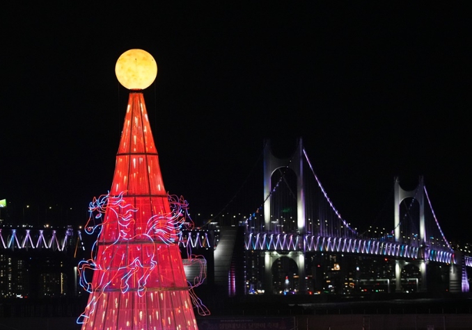 행사에서는 정월대보름을 상징하는 LED 달집 점등식이 진행됐다. 올해 LED 달집은 병오년 ‘붉은 말의 해’를 반영해 파도와 오륙도, 말을 형상화한 디자인으로 제작됐다.