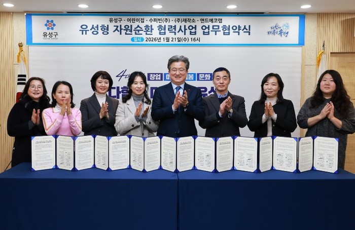 이번 협약은 어린이집과 기업이 협력해 고품질 재활용 자원을 회수하고, 새활용제품 소비와 체험 활동으로 연계하는 선순환 체계를 구축하기 위해 마련됐으며, 대전어린이집연합회 유성구지회·수퍼빈㈜·㈜재작소·앤드에코랩 등 8개 기관이 참여했다.
