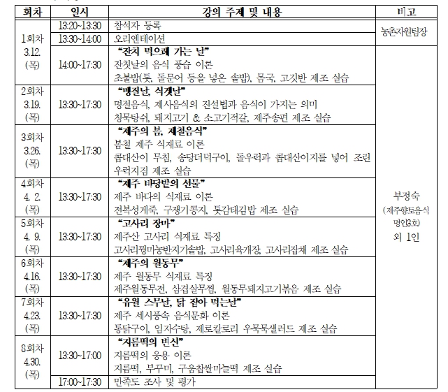 교육은 3월 12일부터 4월 30일까지 매주 1회, 총 8회에 걸쳐 진행된다. 강사는 제주향토음식명인(3호) 부정숙 제주음식문화원 원장이 맡는다. 80% 이상 출석하면 수료증을 받을 수 있다.