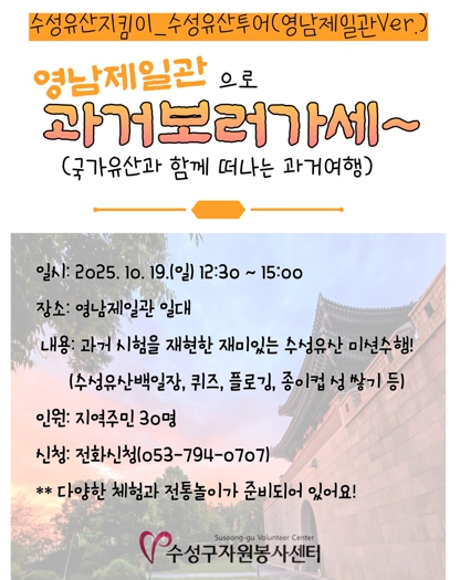 [파이낸셜경제=김지훈 기자] 수성구자원봉사센터 소속 수성유산지킴이는 오는 19일 영남제일관 일대에서 지역 주민을 대상으로 한 문화 체험 프로그램 ‘영남제일관으로 과거 보러 가세’를 진행한다.