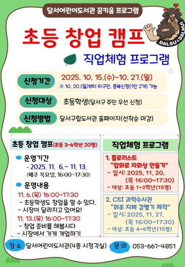 이태훈 달서구청장은 “달서어린이도서관의 ‘꿈 키움 프로그램’이 4차 산업혁명 시대를 살아갈 어린이들에게 창의적 도전정신과 미래 역량을 키우는 좋은 계기가 되길 바란다”며 “앞으로도 아이들이 다양한 직업을 체험하며 꿈을 키워갈 수 있도록 지속적으로 지원하겠다”고 밝혔다.