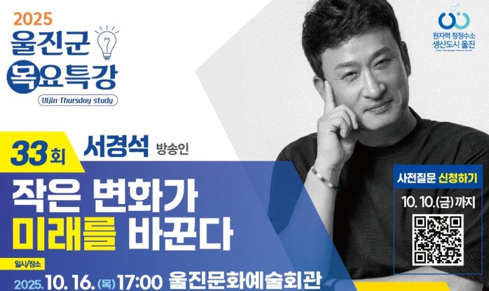 [파이낸셜경제=김지훈 기자] 울진군은 오는 10월 16일 오후 5시 후포면 울진문화예술회관에서 제33회 울진군 목요특강을 개최한다.