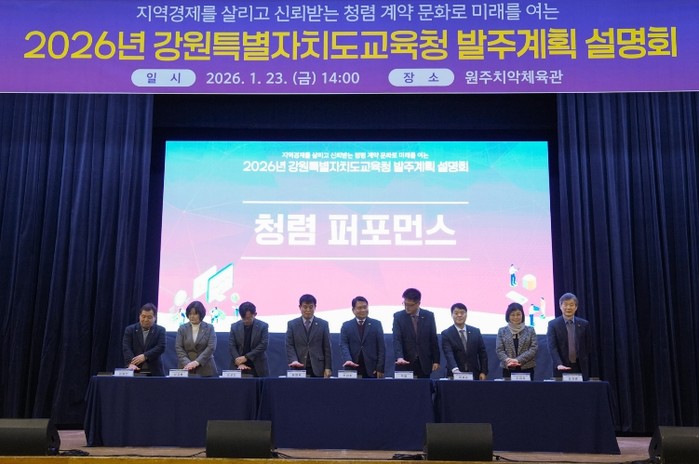 [파이낸셜경제=조성환 기자] 강원특별자치도교육청은 23일 원주 치악체육관에서 청렴한 계약문화 확산과 지역경제 상생을 위한 ‘2026년 공사·용역·물품 발주계획 설명회’를 개최했다.