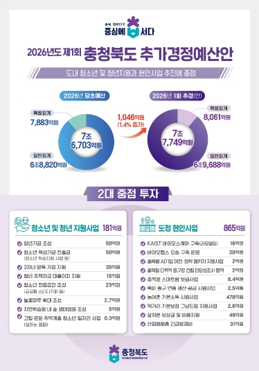 충북도는 재정여건이 어려운 상황이나, 당초예산 편성 시 예측하지 못한 도민 체감형 위주의 사업과 상반기 추진이 시급한 현안사업을 위해, 교육청과 재산이관 수입 및 보조금 등을 활용해 추경 예산을 편성했다.