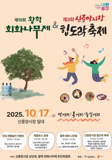 [파이낸셜경제=김예빈 기자] 서울 중구 황학동의 오랜 전통을 품은‘황학회화나무제’와 젊은 감각이 살아 있는‘신중앙시장 힙도락(HIP:道樂) 축제’가 오는 17일 오후 2시에 함께 열린다. 두 축제는 2023년부터 연계 개최해, 황학동의 가을을 더욱 풍성히 채우고 있다.