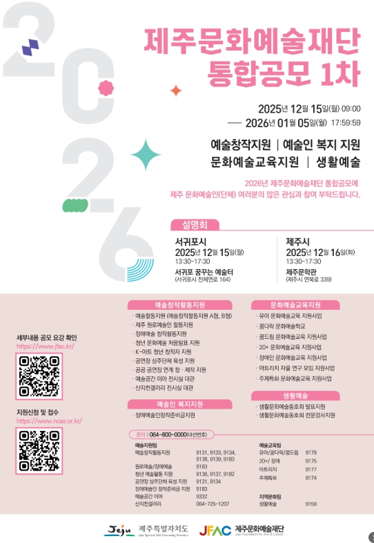[파이낸셜경제=김영란 기자] 제주문화예술재단(이사장 김석윤)은 2026년도 지원사업 1차 통합공모를 실시한다. 접수 기간은 2025년 12월 15일부터 2026년 1월 5일까지이며, 문화예술교육 지원사업은 2026년 1월 9일까지 접수한다.