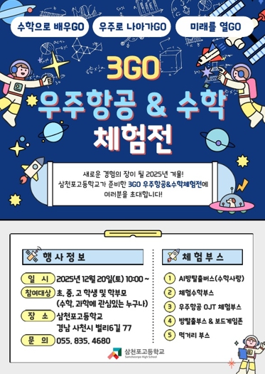 [파이낸셜경제=김예빈 기자] 삼천포고등학교는 오는 12월 20일 오전 10시부터 교내에서 ‘3GO 우주항공&수학 체험전’을 개최한다.