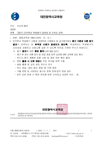 [파이낸셜경제=김영란 기자] 대전시교육청은 11월 7일 단위학교의 수행평가 및 실기평가 관련 공정성을 강화하도록 전 학교에 긴급 안내했다고 밝혔다.