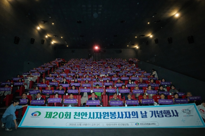 [파이낸셜경제=김영란 기자] 천안시자원봉사센터는 10일 롯데시네마 천안불당점에서 ‘제20회 천안시자원봉사자의 날 기념행사’를 열고, 지역사회를 위해 헌신한 자원봉사자들의 노고를 격려했다.