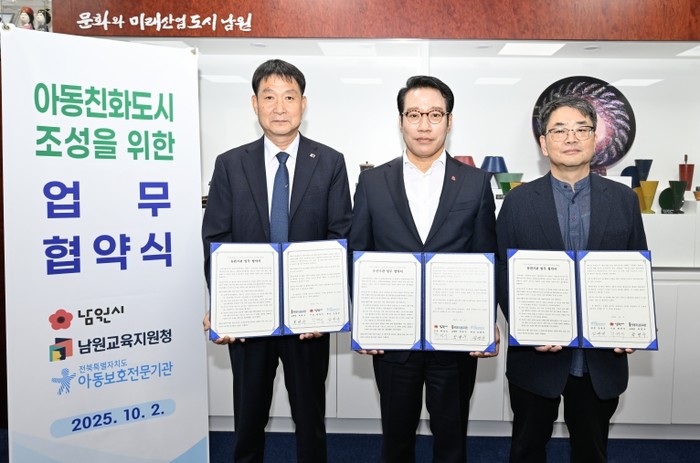 [파이낸셜경제=김예빈 기자] 남원시는 지난 2일 남원교육지원청, 전북동부아동보호전문기관과 함께 아동친화도시 조성 및 아동 권리 증진을 위한 업무협약식을 체결했다.