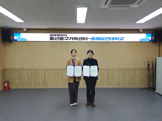 [파이낸셜경제=김예빈 기자] 울산중구가족센터와 춘해보건대학교 글로벌케어과가 12월 10일 오후 2시 울산중구가족센터 다목적실에서‘산학 공동발전 지역 멘토기관’ 업무협약을 체결했다.