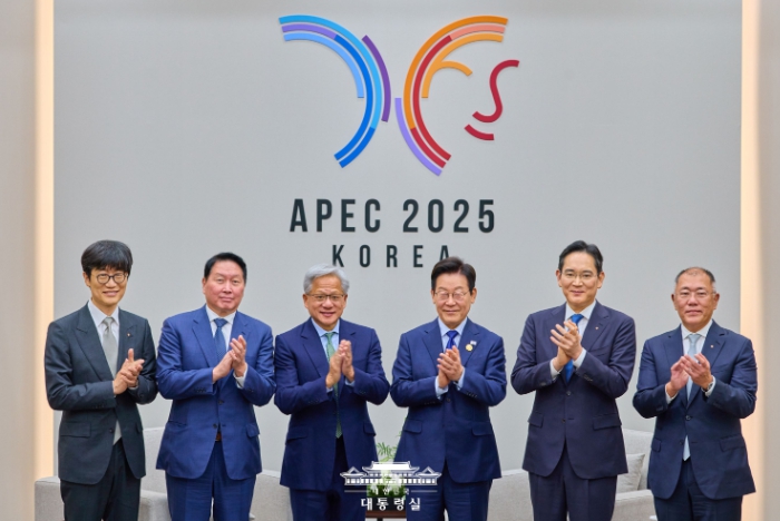 [파이낸셜경제=김예빈 기자] 이재명 대통령은 10월 31일 오후 2시 경주 APEC 정상회의를 계기로 방한한 젠슨 황 엔비디아 대표를 만나, 대한민국 AI 인프라를 비롯한 생태계 전반의 혁신 방안에 대해 의견을 교환했다. 이 자리에는 삼성전자 이재용 회장, SK 최태원 회장, 현대차그룹 정의선 회장, 네이버 이해진 의장이 함께했다.