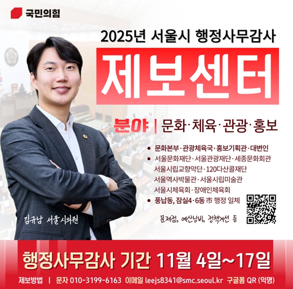 [파이낸셜경제=김예빈 기자] 김규남 서울시의원(송파1·국민의힘)은 오는 11월 4일부터 17일까지 열리는 2025년도 서울시 행정사무감사를 앞두고 시민 참여를 위한 제보센터를 운영한다고 30일 밝혔다.