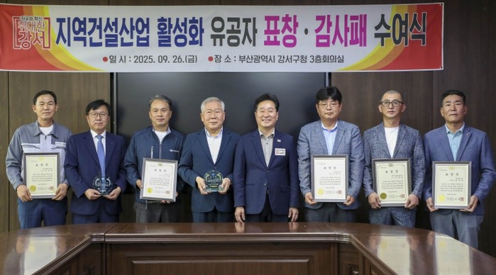 [파이낸셜경제=박영진 기자] 부산 강서구는 9월 26일, 강서구청 3층 구청장실에서 '지역건설산업 활성화 유공자 표창장 및 감사패 수여식'을 개최했다.