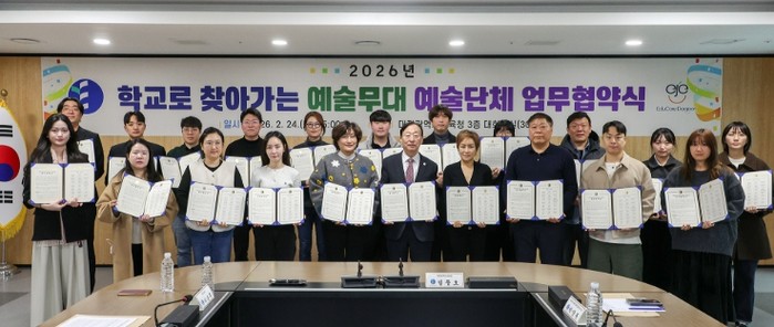 [파이낸셜경제=김영란 기자] 대전시교육청은 2월 24일 오후 3시, ‘2026년 학교로 찾아가는 예술무대’의 원활한 추진을 위해 20개 예술단체와 업무협약을 체결했다.
