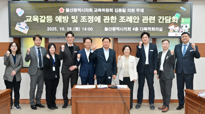 [파이낸셜경제=김예빈 기자] 울산광역시의회 김동칠 의원(교육위원회, 달동ㆍ수암동)은 10월 28일 오후, 시의회 4층 다목적회의실에서 ‘교육갈등 예방 및 조정에 관한 조례안’ 제정을 위한 간담회를 열고 교육 현장에서 발생하는 갈등의 예방 및 조정체계 구축 방안에 대해 논의했다.