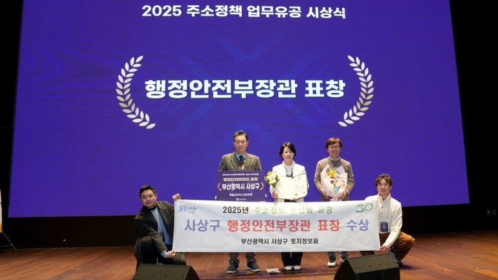 [파이낸셜경제=박영진 기자] 부산 사상구는 지난 18일 행정안전부 주관 ‘2025년 주소정책 성과공유 워크숍’에서 주소정보 업무평가 우수기관으로 선정돼 행정안전부 장관 표창을 수상하고, 특별교부세 4천만 원을 확보했다고 밝혔다.