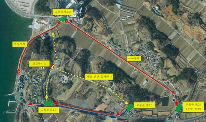 전면통제 구간은 선진공원 내 도로(선진마을 입구, 체리블라썸, 조명군총)이고, 일방통행 구간은 선진마을 주차장→ 스카이나마리나 회전교차로이다.