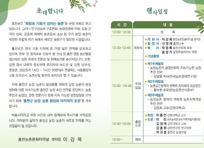이후 종합토론에서는 강원대학교 이종인 교수가 좌장으로 참여하며, 한국농어촌공사 이진 지역개발지원단장, 공주대학교 김정태 교수, 강원연구원 강종원 연구위원, 홍천군청 농정과 이규춘 과장이 함께 심도 있는 논의를 이어갈 예정이다.