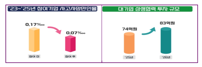 올해는 대기업 220곳이 중소기업 3,160곳과 함께 참여한다. 상생협력 투자 금액은 지난해보다 11.3%(74→83억 원) 증가할 예정이고, 사망·중상해 재해가 발생한 고위험 협력업체, 거래관계가 없는 지역 중소기업 등 안전관리 손길이 필요한 분야에 대한 지원을 강화한다.