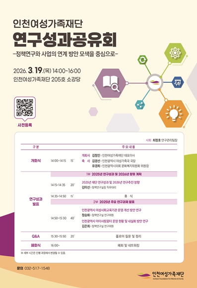 1부는 2025년 연구성과 및 2026년 향후 계획을 발표하는 자리로, 김미선 정책연구실장 직무대리가 총괄 보고를 맡는다. 2부는 2025년 주요 연구과제 발표로, 지난해 수행된 연구과제 중 사업과 맞닿아 있는 ▶인천광역시 여성사회교육기관 운영 개선 방안 연구(정승화 연구위원), ▶인천광역시 아이사랑꿈터 운영 현황 및 내실화 방안 연구(김은희 연구위원) 연구과제가 발표될 예정이다.