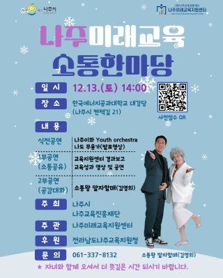 [파이낸셜경제=김예빈 기자] 전라남도 나주시가 미래 교육 성과를 시민과 공유하는 ‘나주미래교육소통한마당’을 오는 12월 13일 한국에너지공과대학교 대강당에서 개최한다.