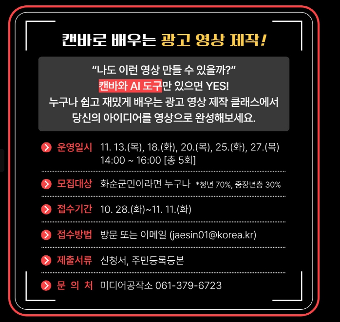 [파이낸셜경제=김예빈 기자] 화순군은 오는 11월13일 오후 2시 화순군 청년센터(청춘들락) 미디어공작소에서 화순군민을 대상으로 AI와 캔바로 배우는 광고영상 제작하기 교육을 진행한다고 밝혔다.