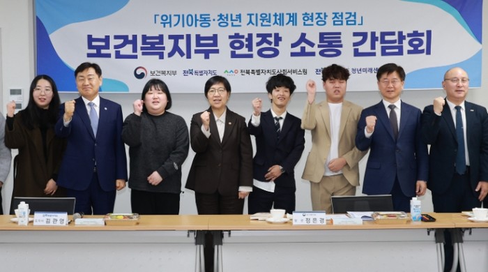 | ▲ 16일 전북특별자치도 청년미래센터에서 열린 위기아동,쳥년 지원체계 보건복지부 현장 소통 간담회에 정은경 보건복지부 장관, 김관영 도지사 등 참석자들이 소통 간담회를 갖고 기념촬영을 하고 있다 |