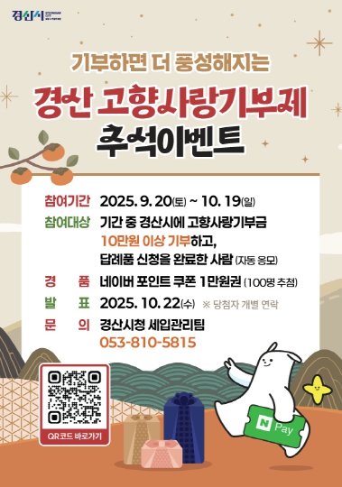 이벤트 대상은 기간 중에 경산시에 10만 원 이상 기부하고 답례품을 선택한 기부자이며, 기부자 중 100명을 무작위로 추첨해 1만 원 상당의 네이버 포인트 쿠폰을 증정한다. 기부하고 답례품을 선택하면 자동 응모되며, 당첨자는 10월 22일 개별 통보할 계획이다.