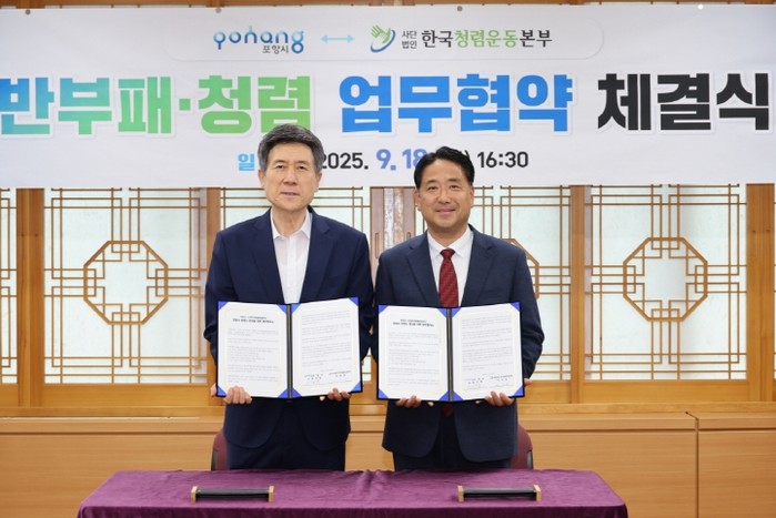 [파이낸셜경제=김지훈 기자] 포항시는 18일 시청 대외협력실에서 (사)한국청렴운동본부(이사장 이지문)와 부패취약분야 개선 및 청렴시책 추진의 전문성 강화를 위한 업무협약을 체결했다고 밝혔다.