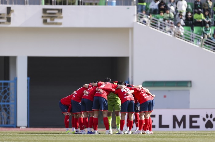 | ▲ 3월 8일 전북전 홈경기에서 김천상무 선수들이 이야기를 나누고 있다. |