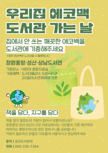 [파이낸셜경제=김예빈 기자] 창원특례시 도서관사업소 창원중앙도서관에서는 도서를 대출하는 시민들의 편의를 높이고 자원 순환 가치를 실현하기 위해 에코백 시민 기증 및 공유 서비스를 운영한다고 밝혔다.