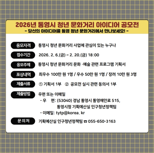 [파이낸셜경제=김예빈 기자] 통영시는 '청년 365 핫플레이스 조성사업'과 연계한 청년 문화·예술 프로그램을 발굴하기 위해 ‘2026년 통영시 청년 문화거리 아이디어 공모전’을 개최한다고 9일 밝혔다.