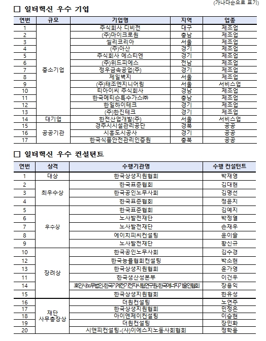 1부에서는 공모와 심사를 통해 선정된 일터혁신 성과 우수기업 17개소와 컨설턴트 경진대회를 통해 선정된 우수 컨설턴트 20명에 대한 시상이 진행됐다.