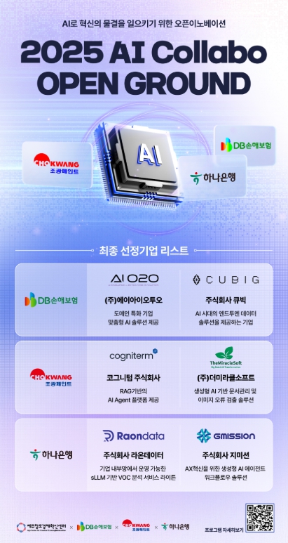[파이낸셜경제=김영란 기자] 제주창조경제혁신센터(대표이사 이병선, 이하 제주센터)는 DB손해보험, 조광페인트, 하나은행과 함께 추진하는 특화산업 오픈이노베이션 ‘2025 AI 콜라보 오픈그라운드 프로그램’을 통해 최종 6개 스타트업을 선정하고, 기술 테스트와 솔루션 개발을 통해 실질적인 사업화 협력에 나선다.