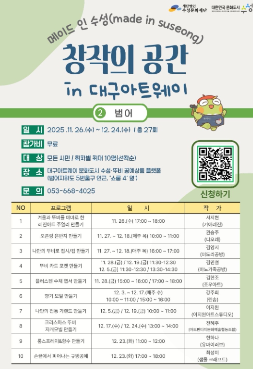 자세한 일정과 프로그램은 대한민국 문화도시 수성 공식 인스타그램에서 확인할 수 있다.