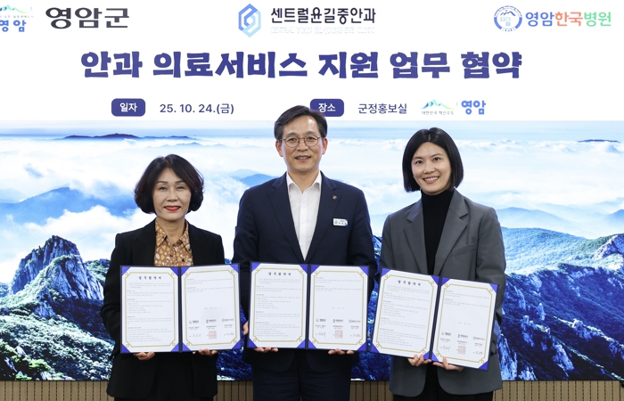 [파이낸셜경제=김예빈 기자] 영암군이 24일 군청에서 센트럴윤길중안과, 영암한국병원과 ‘백내장 수술 지원 민관 협약식’을 체결했다.