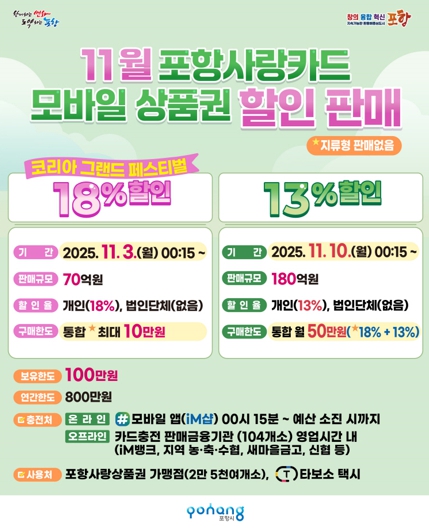 이와 함께 진행하는 포항사랑카드 13% 할인판매는 내달 10일 0시 15분 모바일 앱(iM샵)과 104개 판매 대행 금융기관 영업점에서 충전할 수 있다. 11월 포항사랑카드 개인 구매 한도는 50만 원으로 18% 할인과 13% 할인을 모두 합한 충전 금액이며, 보유 한도는 100만 원이다.